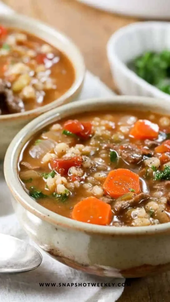 This soup is simple enough for weeknights but hearty enough to serve as a full meal. You’ll sauté onions and garlic until fragrant, add beef and veggies for depth, stir in pearl barley for texture, and let everything simmer until it’s tender and flavorful.