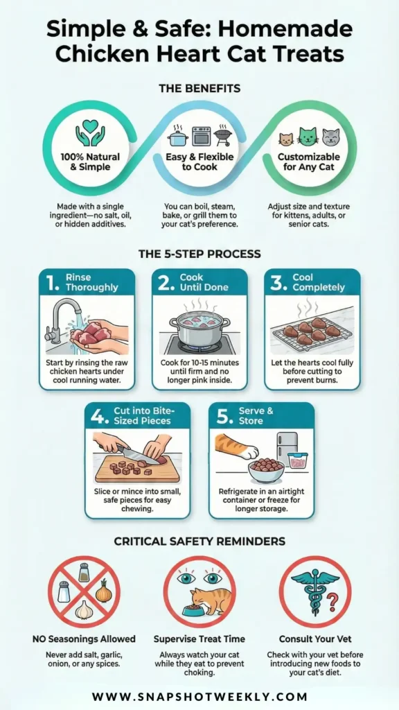 What makes this recipe nice is how simple it is. Chicken hearts have a soft texture when cooked and can be cut very small, which works well for many cats. You can prepare them in different ways without changing the ingredient list.
