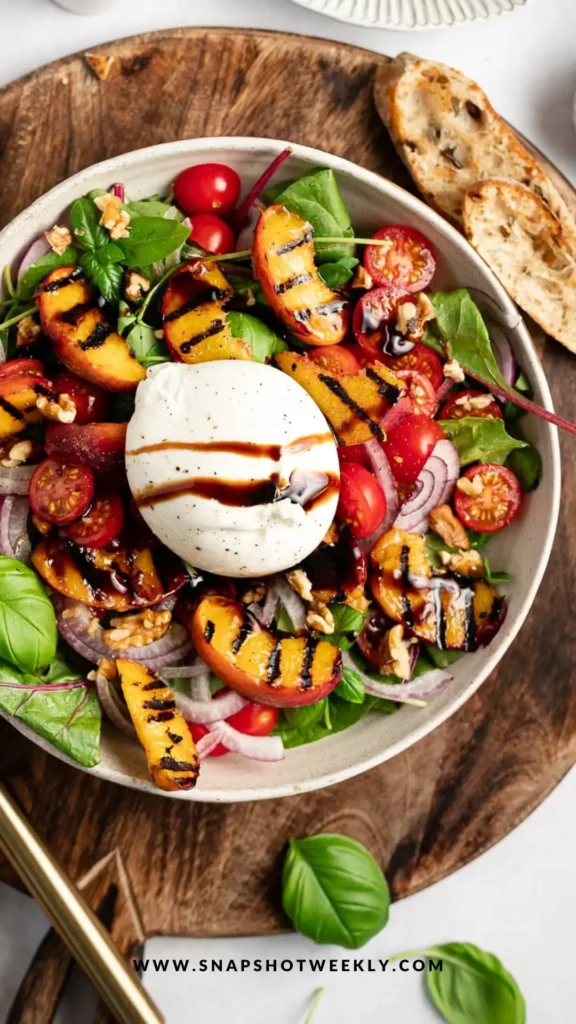 The first time I made this salad, I was stunned by how something so simple could taste so elegant. Grilling the peaches takes their natural sweetness to a new level — the heat caramelizes their sugars, creating soft, golden slices that almost melt in your mouth. Pair that with burrata, a cheese that spills creamy goodness the second you cut into it, and you’ve got a dish that’s as beautiful as it is delicious.