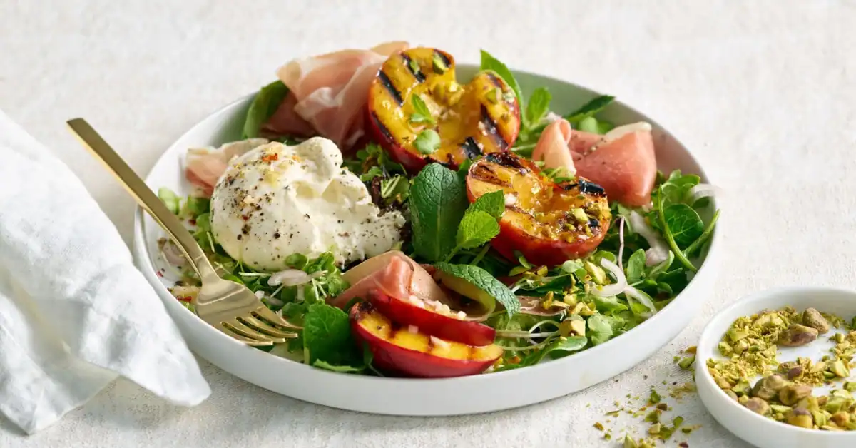 • This salad is best eaten fresh. You can prep the salad leaves, tomatoes, onion, and walnuts ahead of time, but grill the peaches and tear the burrata just before serving for the best flavor and texture.