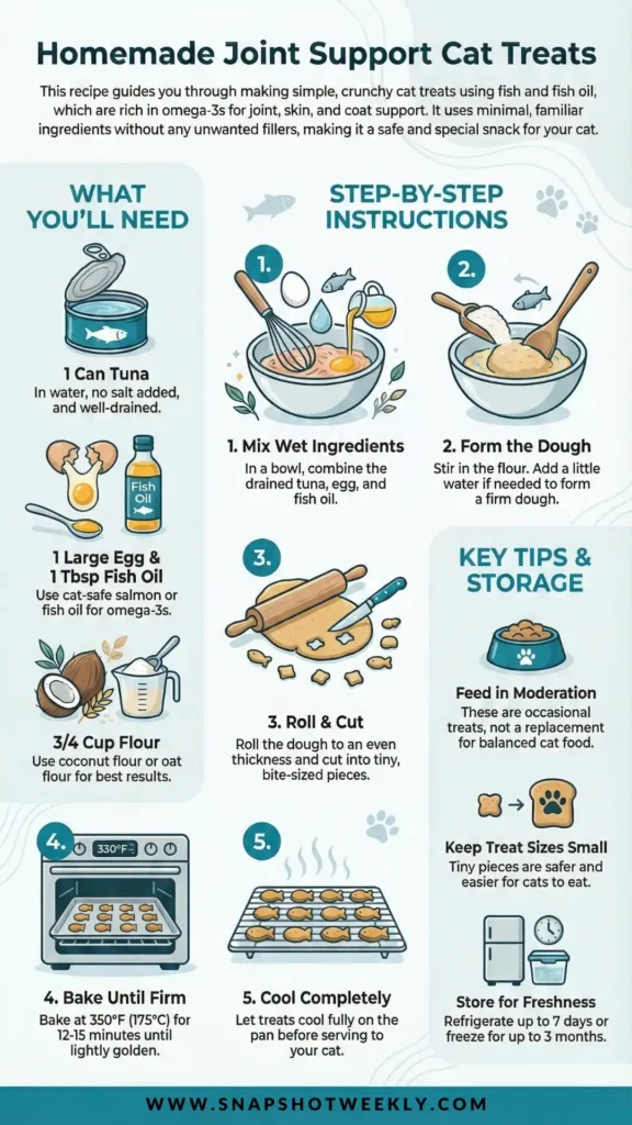 I’m so happy to share this homemade joint support cat treat recipe because it uses simple, familiar ingredients many cat parents already trust. These baked treats focus on fish and fish oil, which are rich in omega-3 fats that can support joints, skin, and coat. I like that I can control what goes in, with no extra fillers or strange additives. The treats bake quickly and come out firm and crunchy, which many cats enjoy. They are meant as an occasional snack, not a replacement for a full and balanced cat diet.